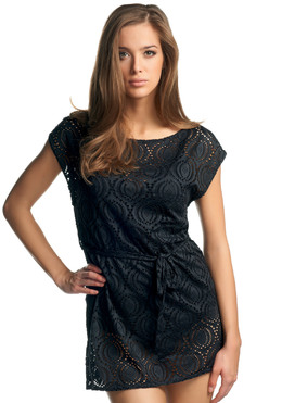 Ażurowa tunika plażowa Freya Cha Cha w kolorze czarnym. Uszyta z rozciągliwego materiału o szydełkowej strukturze. W pasie paseczek do wiązania. Łódkowy dekolt.